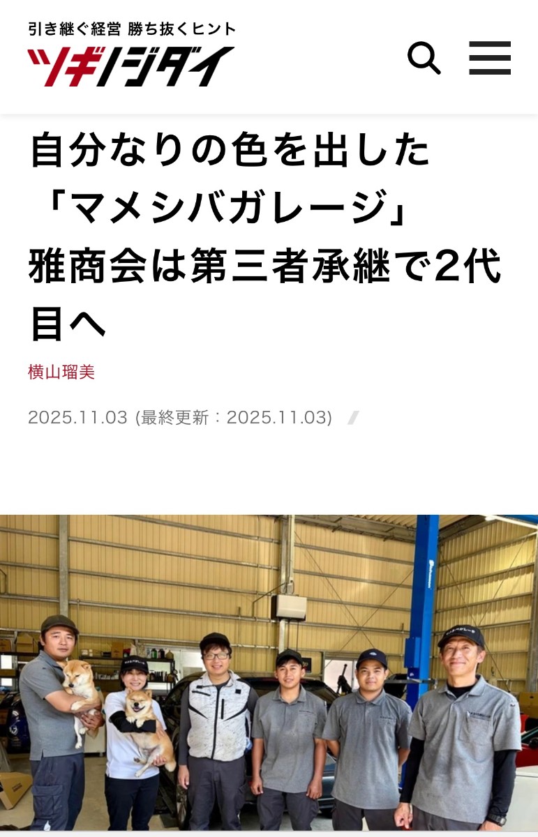 - マメシバガレージです<div><br><div>この度、朝日新聞社の子会社である朝日インタクティブが運営する、</div><div>中小企業の事業承継改善支援を目的としたWebメディアである「<a href="https://smbiz.asahi.com/article/16126254">ツギノジダイ</a>」に</div><div>マメシバガレージが掲載されました🐕🎉</div><div>みなさまにもお読みいただけましたら幸いです🐕♡<br></div><div>チョビ君の笑顔が素敵な一枚です📷</div><div><br></div><div>これからも従業員ともども頑張っていきますのでよろしく願いいたします</div><div><br></div><div><br></div><div><br></div></div>