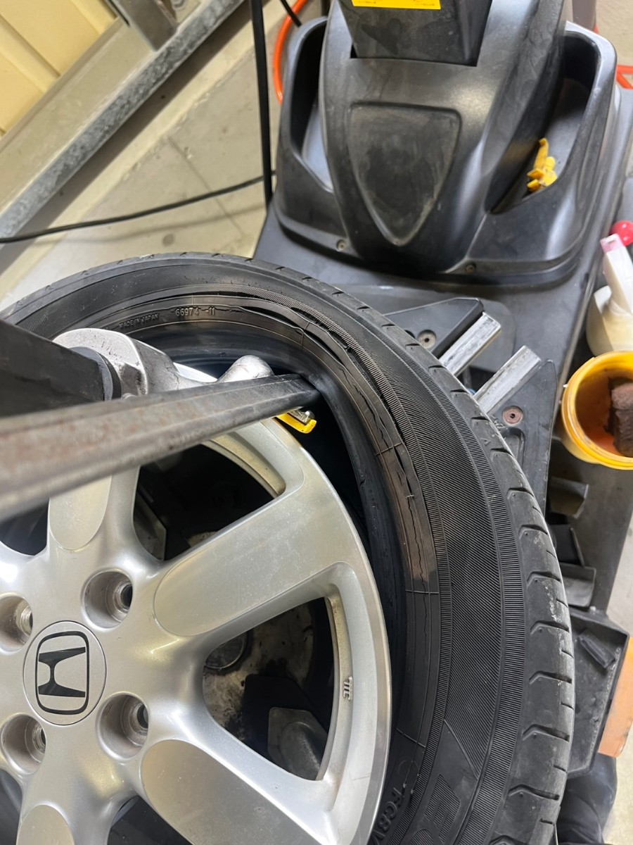 タイヤを外すためタイヤを持ち上げるとひび割れの影響で裂ける手前でした